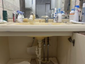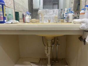 今回は、蛇口本体だけでなく、下部の給水管からも水漏れが発生している状態で、床下まで水が落ちてしまうほど深刻な状況でした。長期間にわたって少しずつ漏れていた可能性が高く、放置すると床材の腐食やカビの発生につながってしまいます。